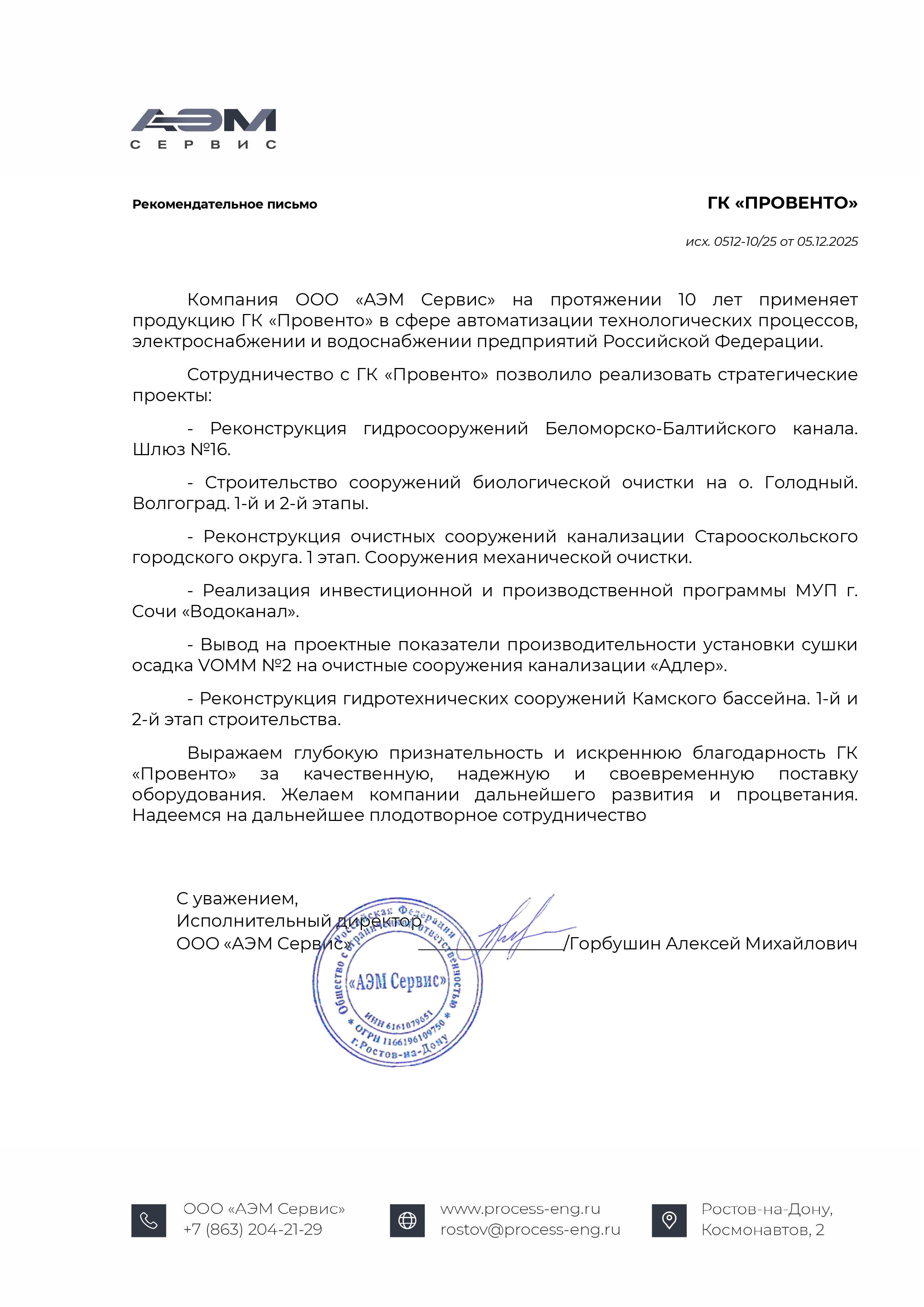 Рекомендательное письмо от ООО «Аэм Сервис»