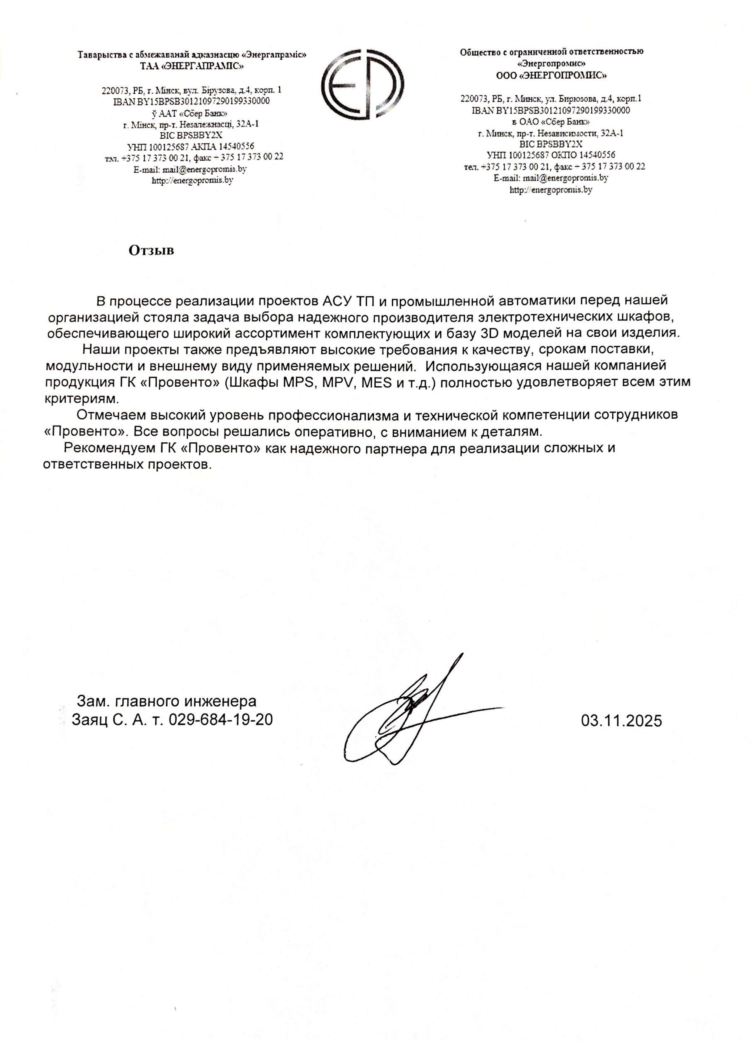 Рекомендательное письмо от ООО «Энергопромис»
